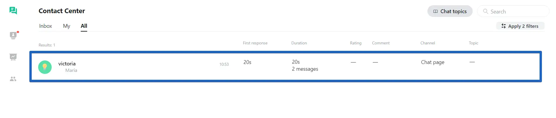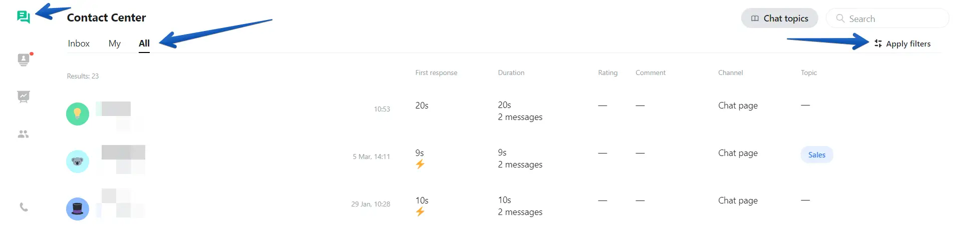 After logging into your Jivo, access 'Contact Center' and go to the 'All' tab, then select 'Apply Filters' in the top right corner, as in the image: