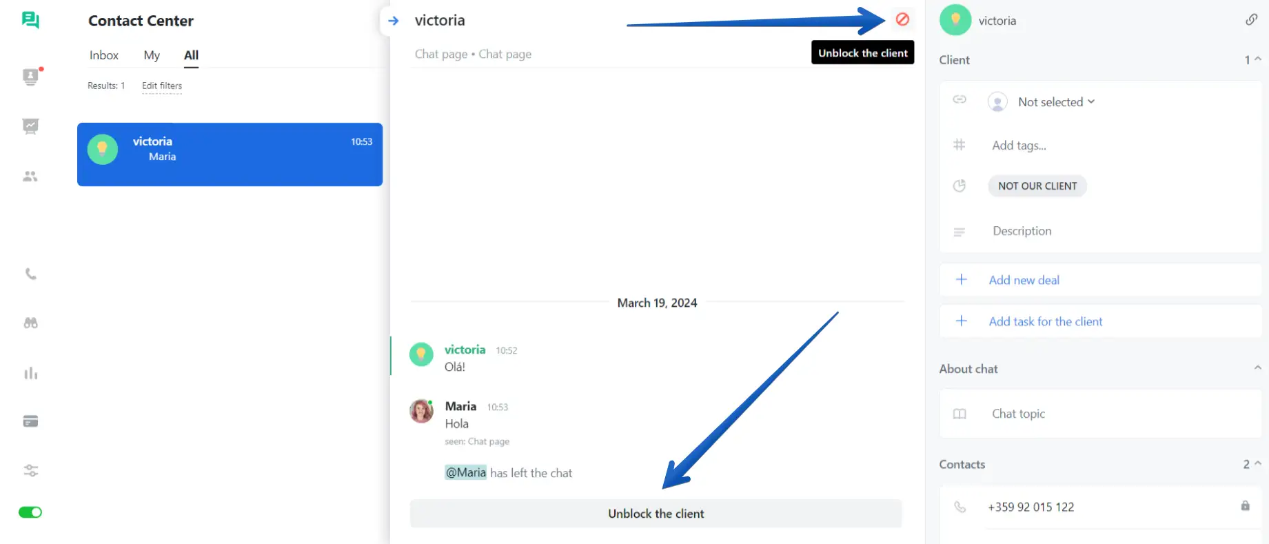 Once the conversation is open, you can click on any of the 2 options pointed in the image below to unblock the client.