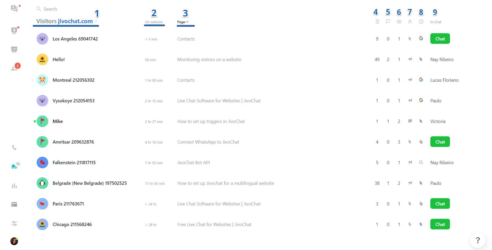 1.The city of the visitor (or if the visitor fills in the "name" field in the chat, it will show only name instead)