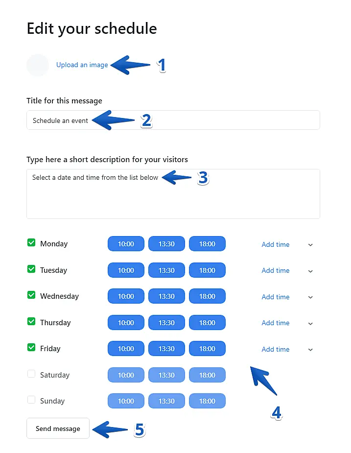 Upload an image (1; optional) to your event, a title (2), description (3), select the future dates and times (4) that will be a part of the schedule, and press "Send message" (5) when you're ready to send the schedule to the client in chat.
