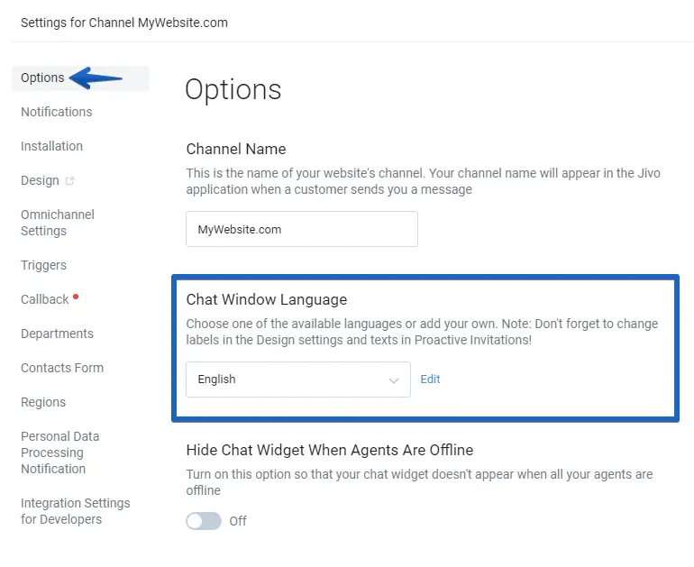 To change the language of the chat widget on your website, open the JivoChat web app or any of our Desktop agent apps then go to Manage -> Channels -> Settings (next to your website channel).