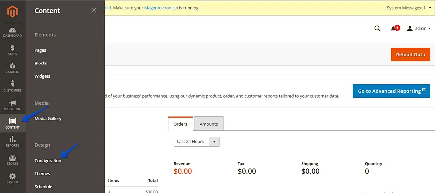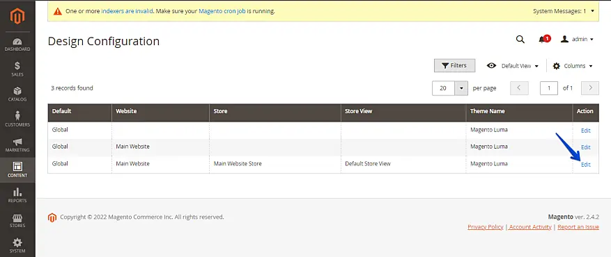 Go to the Magento Admin Panel, continue to the "Content" menu and click on "Configuration" under the "Design" button: