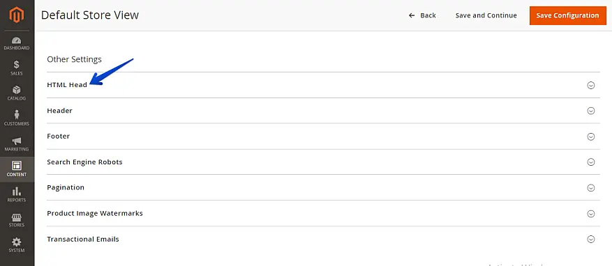 Go back to the Magento dashboard, click on the "HTML Head" button like shown below: