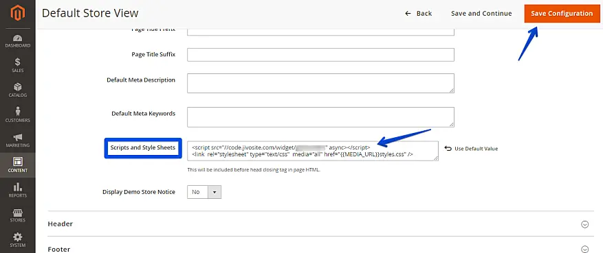 Go to "Scripts and Style Sheets", add the code you copied from JivoChat and then click on "Save Configuration"