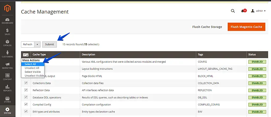 Open the "System" menu in the left panel, check all options in the "Cache Management" section and click "Refresh/Submit".