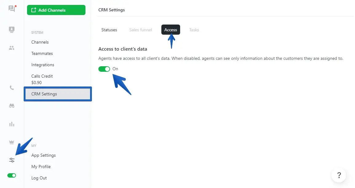 1. Open your JivoChat web app or any of our Desktop apps and go to Manage -> CRM Settings -> Access -> Enable the Access to client's data option.