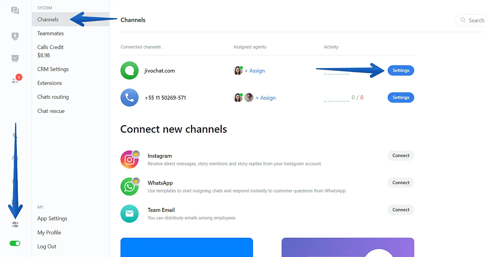 If you want to change the notifications settings on your account, open the JivoChat web app or any of our Desktop apps and go to Manage -> Channels -> Settings from the Channel: