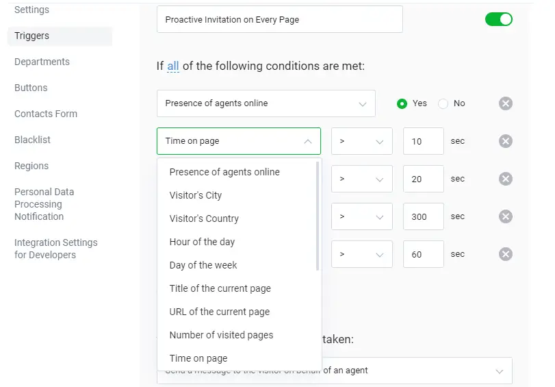 The JivoChat service offers a wide range of options for the JivoChat box pop up invitation via Admin Panel Triggers’ settings: