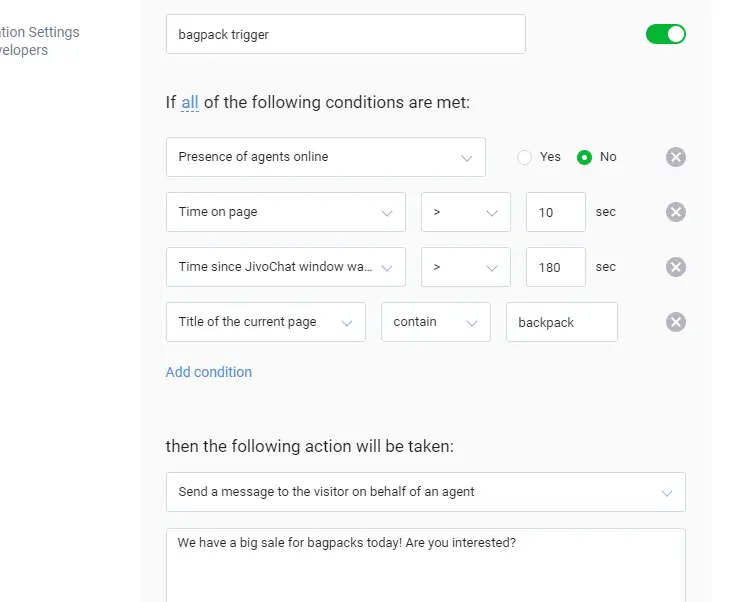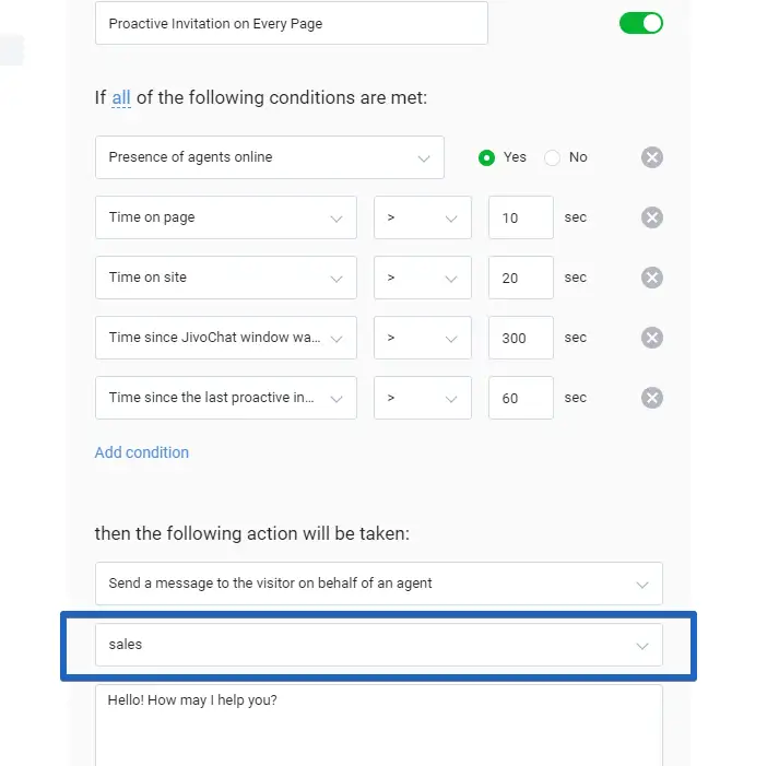 The fourth and the fifth conditions are: "Time since the last proactive invitation" and "Time since JivoChat window was closed". These conditions exist in case to prevent chat window to pop up on every page and do not irritate visitors. Why do we need two conditions? The time since the last proactive invitation is counted from the moment when the invitation popped up the last time. The default setting is 60 seconds, which means that when the visitor comes to the target page, the invitation does not pop up until 60 seconds have elapsed since the last active invitation. With time since JivoChat window was closed is the same triggering but if the chat was closed by X. It will be better if you set this time value more than "Time since the last proactive invitation" in case the visitor doesn’t want to be bothered. For future settings we won't use "Time since the last proactive invitation" condition. And set the value of "Time since JivoChat window was closed" for 180 seconds (you can use any value for your own site).